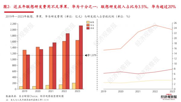 相比之下,联想的研发投入不到苹果和华为的十分之一,去年研发费用为153亿元,研发投入占营收比例仅为3.4%。