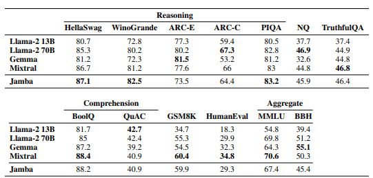 而且当前Jamba训练的52B参数MOE Mamba-Transformer混合体,据推断,该模型有12B个主动参数,且其基准分数与Llama-2 70B和Mixtral相当,如上图所示。
