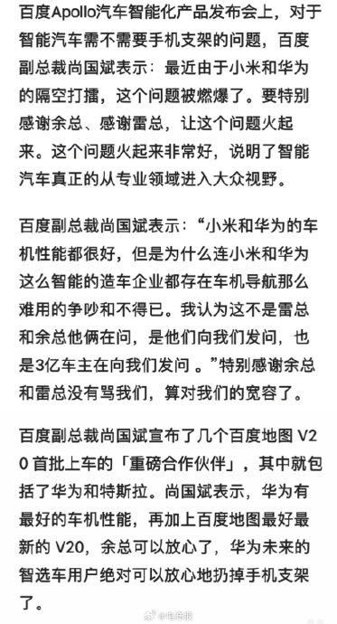 百度副总裁评华为小米打擂台,力挺余承东:余总放心,华为未来的智选车用户绝对可以放心地扔掉手机支架。