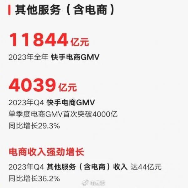 至此,快手成为了继淘宝、京东、拼多多、抖音后第五个突破万亿大关的电商零售平台。同时,在2023年第四季度,快手商城取得了进展,GMV同比增速超过了50%。