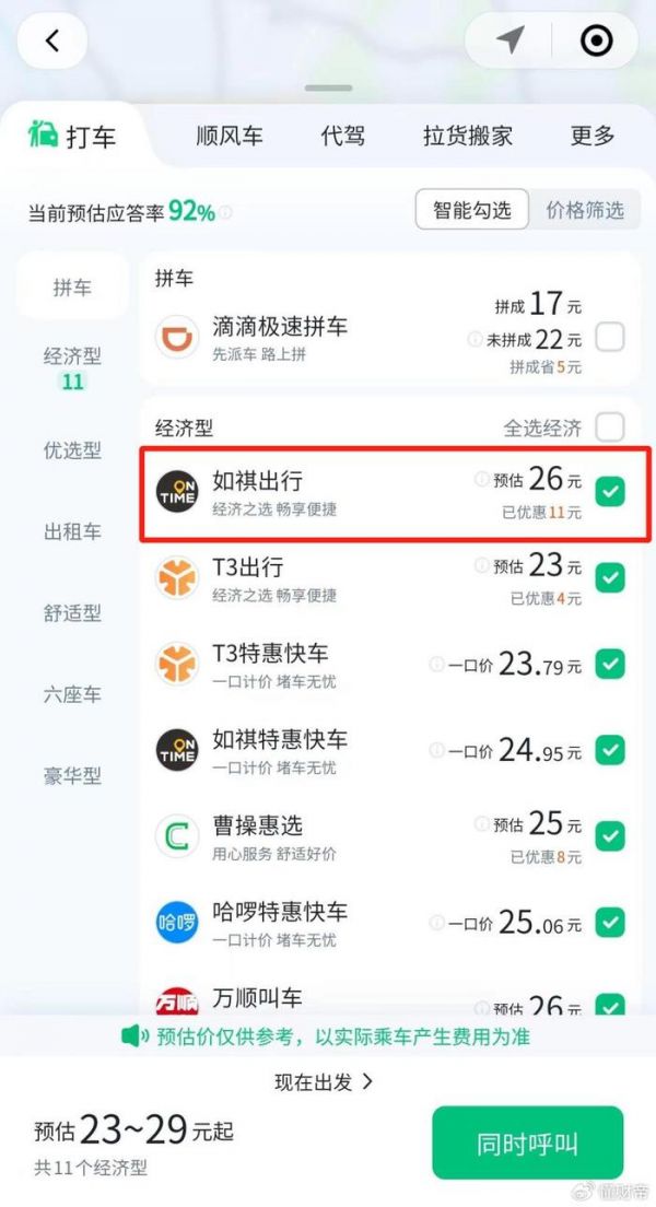 打开微信的“出行服务”,如祺出行即使价格更高,但仍被推荐在“经济型”最前列。可见,腾讯还是重视如祺出行的。