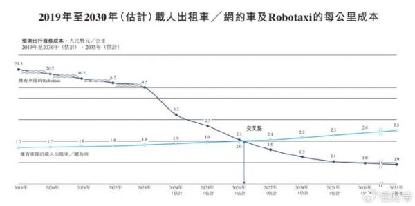 弗若斯特沙利文估算,2019年至2023年,载人出租车成本从1.7元/公里小幅上涨至1.8元/公里,Robotaxi成本则会从23.3元/公里大幅下降至4.5元/公里。预计在2026年,两者的成本出现交叉点,越往后,载人出租车越高,Robotaxi反之。