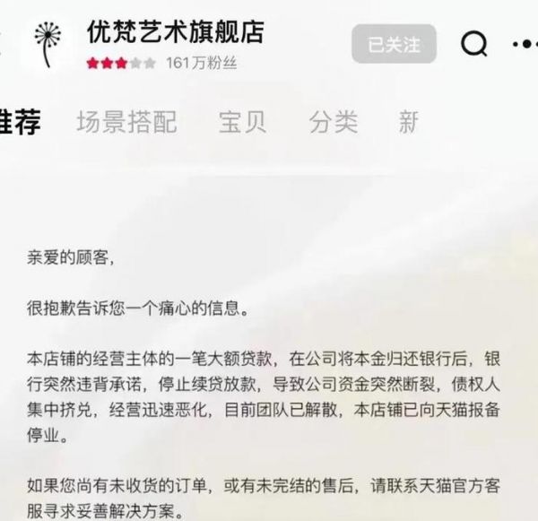 4月22日消息,被称为“家居界ZARA”的知名家具品牌优梵艺术旗舰店在淘宝店铺公告显示,因银行突然停止续贷放款,导致公司资金突然断裂,债权人集中挤兑,经营迅速恶化,目前团队已解散,本店铺已向天猫报备停业。并称公司已无支付能力,即将进入破产清算程序。