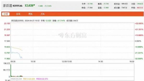 4月23日,奶茶连锁企业茶百道在香港主板上市,发行价为每股17.50港元。但遗憾的是,首日股价便遭遇重挫,开盘破发后,跌幅一度逾38.29%。截至上午收盘,市值仅剩164.9亿元。