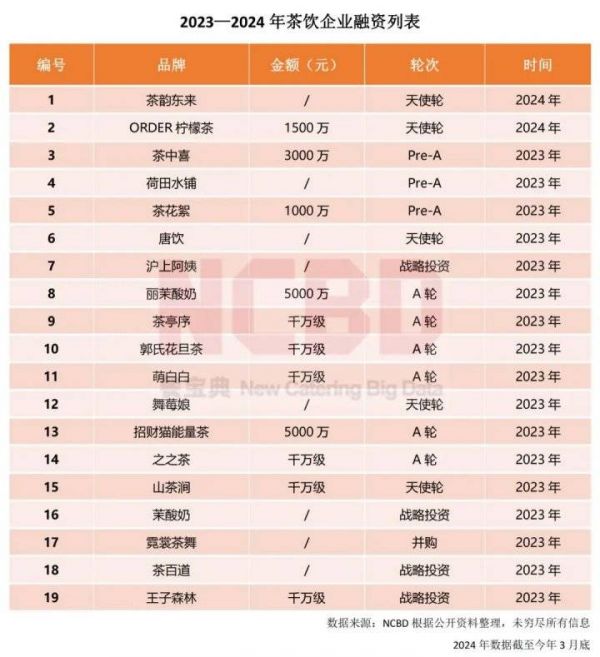 近日,据NCBD(餐宝典)发布的《2023-2024中式新茶饮行业发展报告》显示,2023~2024年3月底,新茶饮企业融资一共19笔,其中截止到三月底,2024年一共只有两笔融资。相较前几年新茶饮行业的投资热潮,动辄数亿元,风确实沉寂不少。