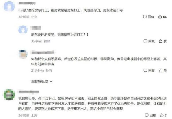也有网友认为成败在自己,“觉得房租贵,你可以不租,如果房子租不出去,租金自然会降,说到底还是你自己开店之前要做好计划与预期”。