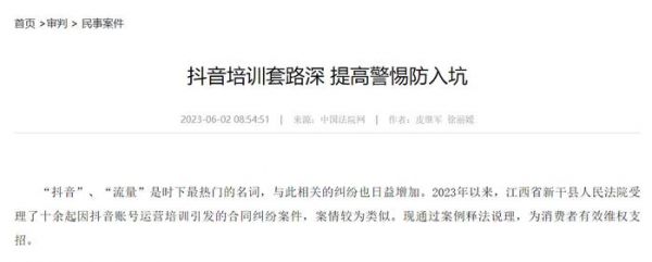 例如,2023年6月,中国法院网就报道了一个司法案例,起因是某传媒公司通过网络发布广告,许诺购买其抖音账号运营的培训课程后,能为账号引流,流量变现会带来不菲收益。培训费高达29800元,承诺向其提供策划、视频推广、培训支持等服务。