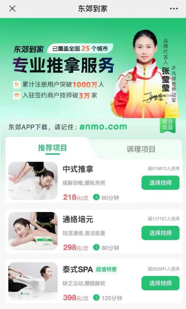 点开东郊到家小程序的服务页面,顶部是醒目的代言人照片——手举金牌的乒乓球世界冠军张莹莹,旁边的广告语上写着:专业推拿服务,再附上一行小字“累计注册用户突破1000万人”。