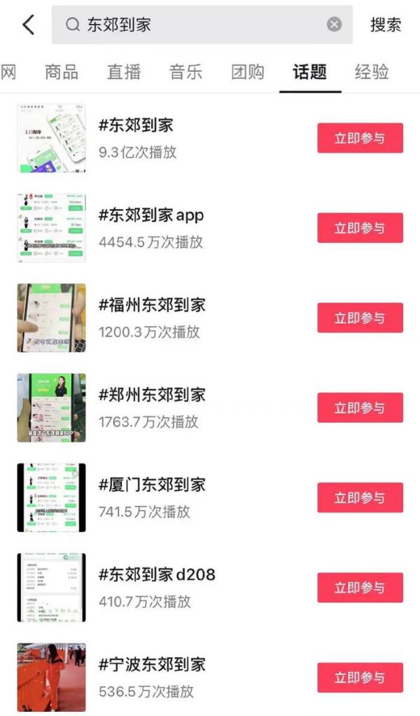 凤凰网科技在抖音检索东郊到家相关话题词发现,截至目前,东郊到家在抖音已有9.3亿次播放,其中,多数为达人发布的相关广告内容。