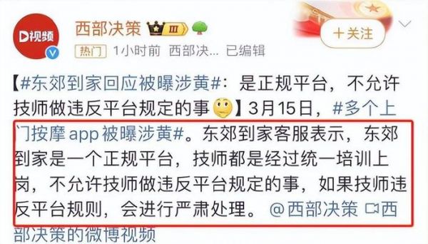 但东郊到家官方已否认上述情况,表示自己是一家正规平台,技师都是经过统一培训,不允许做违反平台规定的事,会对涉事技师进行严肃处理。