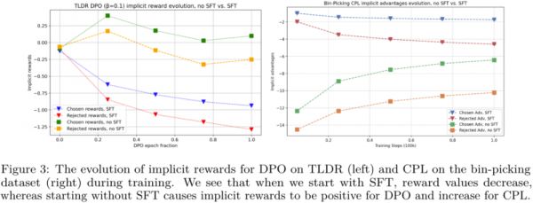 从图 3 可以看出,当在 DPO 之前执行 SFT 时,被选取和被拒绝的响应的隐含奖励都会下降,但它们的差距会变大。