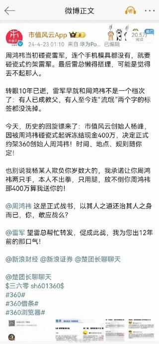 因被起诉冻结现金400万,市值风云创始人杨峰约架360周鸿祎:不出拳,只用腿,放不倒送400万。[吃瓜]