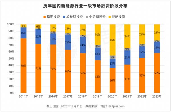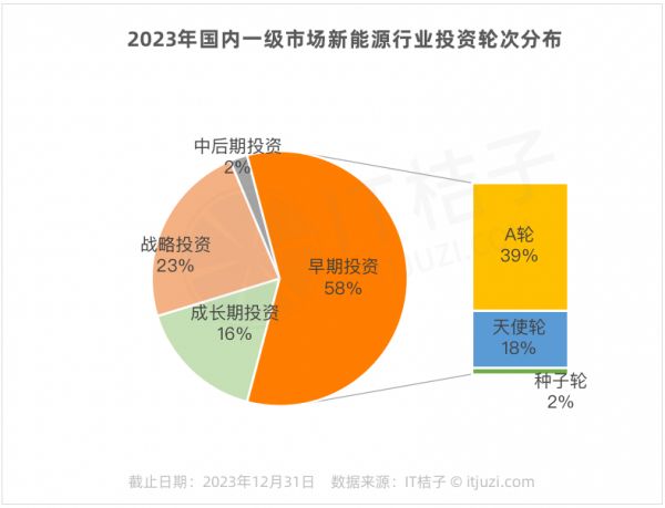 具体看2023年的情况,国内新能源行业一级市场投资仍以早期投资为主,其中A轮占比最多,达到39%。紧随其后的是战略投资,占比达到23%。