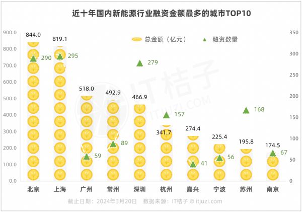 以总体融资事件论,上海的新能源企业获得了资本最高的关注度,融资事件数量略超北京,但其融资总金额不及北京,北京的新能源企业以844亿元的总融资额位居全国首位。