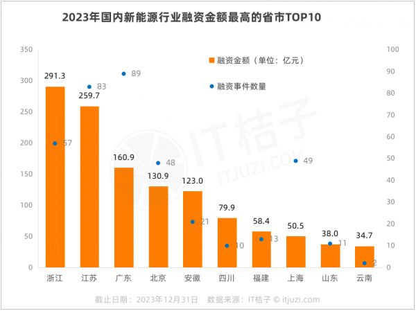 具体看2023年新能源融资金额最高的省市,江苏省以291.3亿元的融资金额位居榜首。