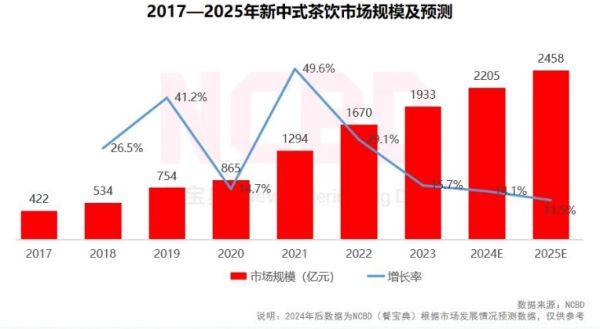 尽管近几年新茶饮赛道的声量大不如前,但大盘仍在。NCBD(餐宝典)近日发布《2023-2024中国茶饮行业年度发展报告》显示,2023年,新中式茶饮市场规模达1933亿元,同比增加15.7%,预计到2025年,新中式茶饮市场规模将逼近2500亿元。