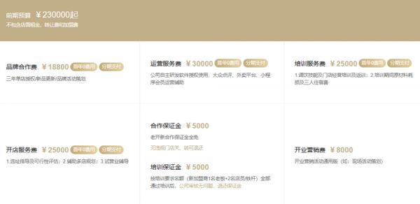 还能从加盟费上大赚一笔的时代似乎一去不复返了。近几日,锌刻度从古茗官方处了解到,包含18800元的品牌合作费、30000元的运营服务费、25000元的培训服务费以及25000元的开店服务费如今都有了首年0费用的优惠政策,即总计9.88万元的加盟费可以在三年合同期内分期付款,签约后第13个月收取2.5万,第19个月再收取4.88万;第25个月收取剩余的2.5万元。