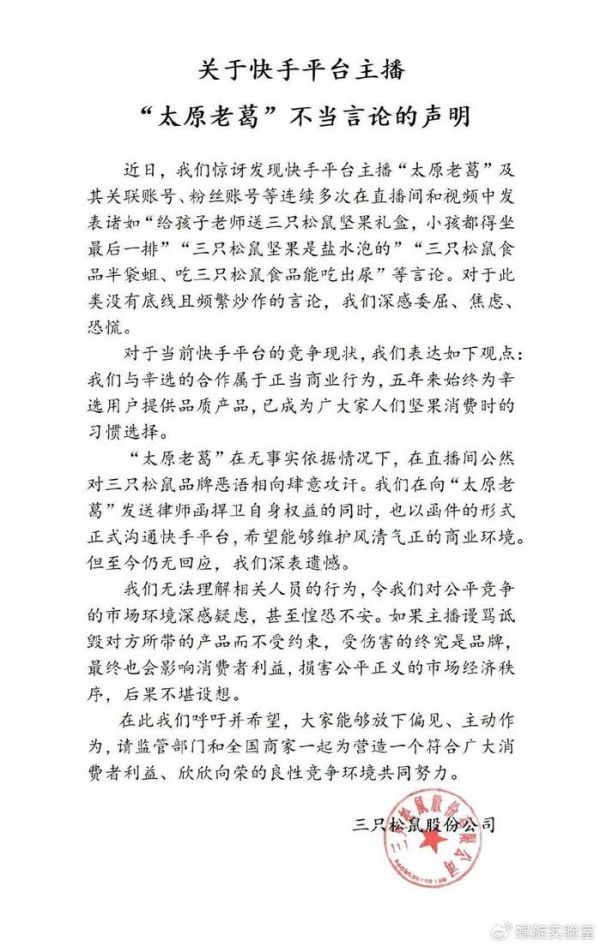 比如此前辛巴曾在直播间带货三只松鼠的坚果礼盒,但太原老葛及其团队账号却在直播和短视频中多次攻击三只松鼠品牌形象,甚至还一度引来了三只松鼠官方的投诉。