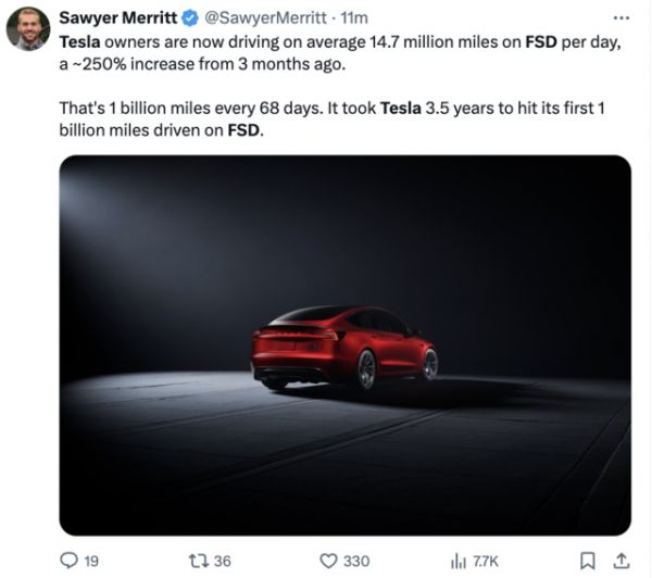 电动汽车分析师、特斯拉投资人Sawyer Merritt表示,数据显示FSD正加速普及,与3个月前相比,特斯拉车主在FSD模式下的日均行驶里程增加了约250%,达到1470万英里。