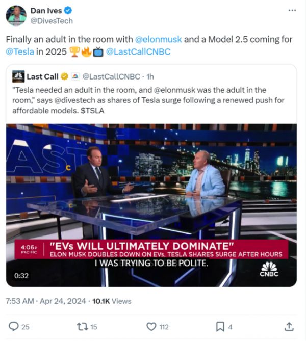 在特斯拉宣布维持新车型的计划后,长期看涨特斯拉的Wedbush分析师Dan Ives接受媒体采访时表示:Model 2.5将在2025年亮相。