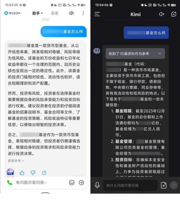 于是拿着最近看好的一只基金,首先询问了一直在用的文心一言和Kimi这两个通用AI工具。乍一看,它们的回答以文字为主,答案分了段落或者对重点内容进行加粗,基础的一些信息是有的。但一眼瞅上去密密麻麻的文字,不容易在第一时间看明白。