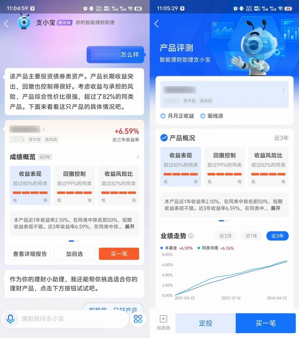 相对比来说,金融垂类的AI助理支小宝,明显有服务理财用户的经验,数据分析的专业维度和内容更丰富,比如超额收益、风险控制等指标。