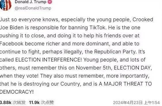 4月22日,美国前总统,同时也是今年总统大选的候选人特朗普,又“口出狂言”了。他在社交媒体上公开表示,“是拜登在推动关闭TikTok”“如果TikTok禁令得以实施,拜登需要负全部责任”,更直白的两句话是“年轻人,包括其他大部分人,在11月5日美国大选时请务必记住这一点!”“他(拜登)正在摧毁我们的国家,这是对民主的重大威胁。”