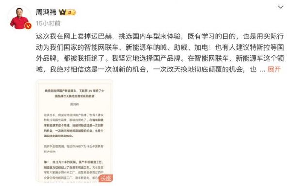 4月22日,三六零集团创始人周鸿祎发微博,解答自己卖掉迈巴赫,坚定选择国产新能源汽车品牌的原因,并全面分析了中国智能网联车发展所具有的五大优势,称在智能网联车、新能源车这个领域,自己绝对相信这是一次创新的机会,一次改天换地彻底颠覆的机会,也是中国品牌全面领先的机会,自己用实际行动为我们国家的智能网联车、新能源车呐喊、助威、加电。