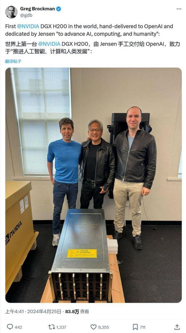 OpenAI 总裁兼联合创始人格雷格布罗克曼(Greg Brockman)发布了一条推文,晒出了山姆阿尔特曼(Sam Altman)、黄仁勋以及布罗克曼的合影,而他们的前方是首台交付的 DGX H200。