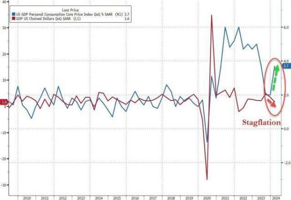 美国昨日公布的两大重磅经济数据,一个是一季度的GDP,一个是一季度的核心物价指数。数据显示,美国第一季度国内生产总值(GDP)同比增长意外大跌至1.6%,较四季度的3.4%下降超50%,为2022年二季度以来的最低水平。