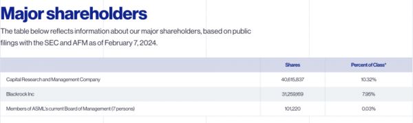 在阿斯麦官网上,它只点明了两大核心股东:分别是美国资本研究管理公司,即全球最大基金之一资本集团(Capital Group)的子公司,以及同样来自美国的贝莱德集团。