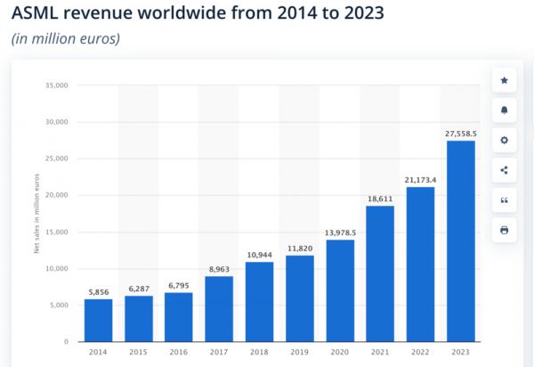 伴随着全球芯片行业的快速增长,阿斯麦的股价在过去5年里已经上涨了近350%,市值提升至约3500亿美元。即使芯片行业经历了两次周期性低迷和新冠疫情,其收入仍以20%的复合年增长率持续增长。