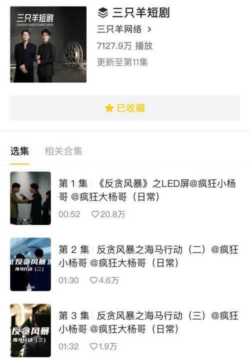 抖音截图但从数据上看,这两部短剧都有些高开低走,拿《反贪风暴》来说,目前第一集有 20.8 万点赞,第二集 4.6 万,第三集只有 1.9 万。两部剧总共 11 集,播放量刚超过 7000 万,跟三只羊网络千万级的粉丝体量以及疯狂小杨哥巨大的 IP 影响力比起来,这个成绩相当一般。