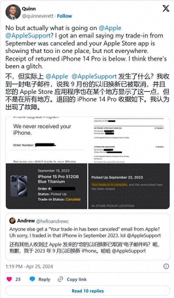 4月26日,据IT之家,苹果公司通知参与iPhone年年焕新计划的用户,已经“取消”此前完成的iPhone以旧换新交易。苹果承认错误发送电子邮件,并向受影响用户再次发送邮件,告知其“忽略此前邮件内容”。