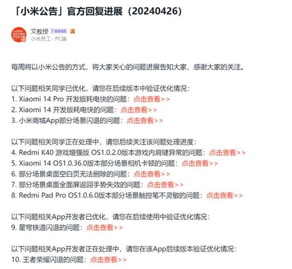 然而,小米并未止步于此,公告中还提到了一些正在处理中的问题,包括红米K40游戏增强版OS1.0.2.0版本游戏内肩键异常、Xiaomi 14 OS1.0.36.0版本部分场景相机卡顿等。