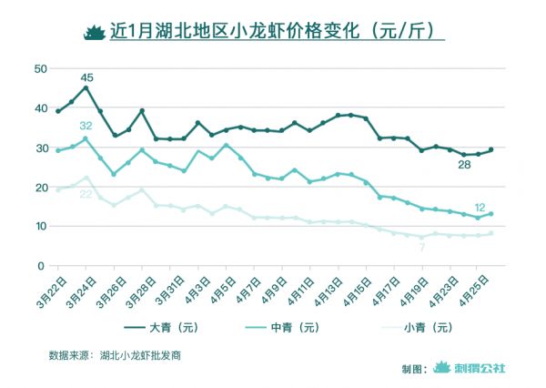 今年3月以来,引领全国小龙虾市场价格的湖北产区就出现了明显的价格变化,大中小青的价格都出现了“开市即巅峰”,随后一路走低的趋势。