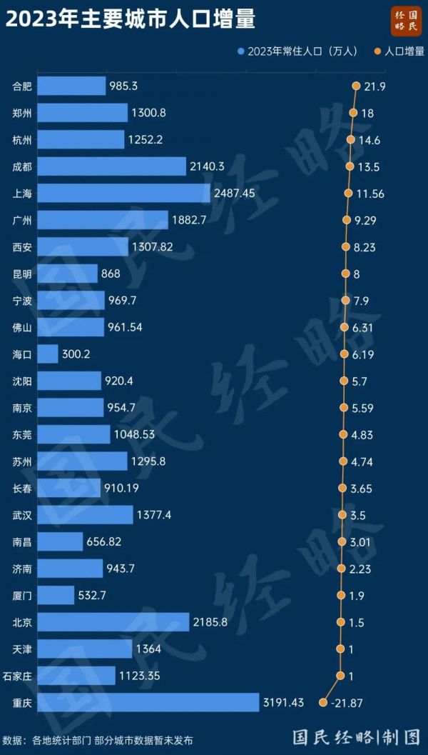 日前,各地公布最新人口数据,合肥以21.9万的增量位居各大城市之首,郑州、杭州、西安、成都等省会均超10万人。