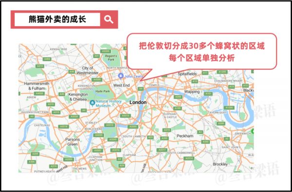 他们把伦敦切分成30多个蜂窝状的区域,每个区域单独分析,研究中餐厅商家不够怎么办,要不要跨区域配送,用什么交通工具配送等细节问题。