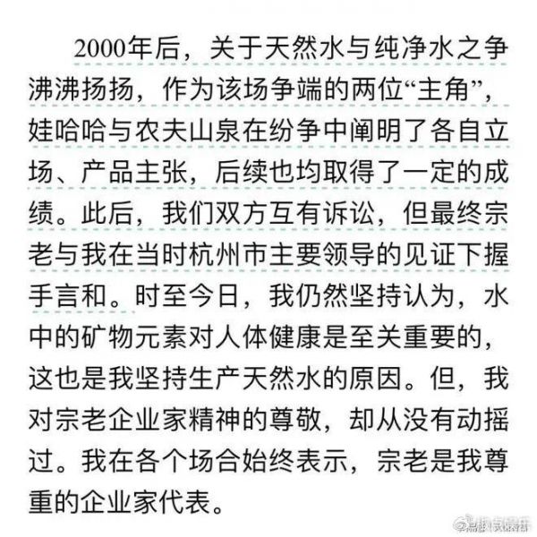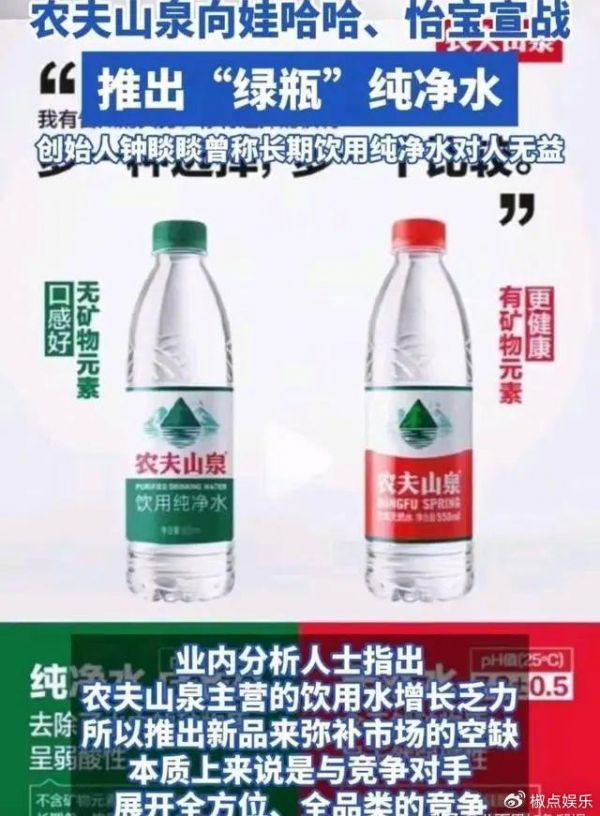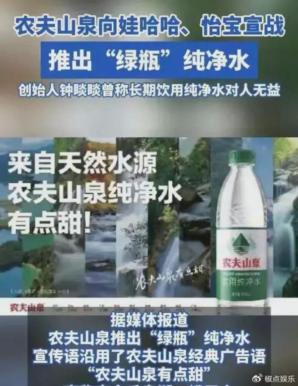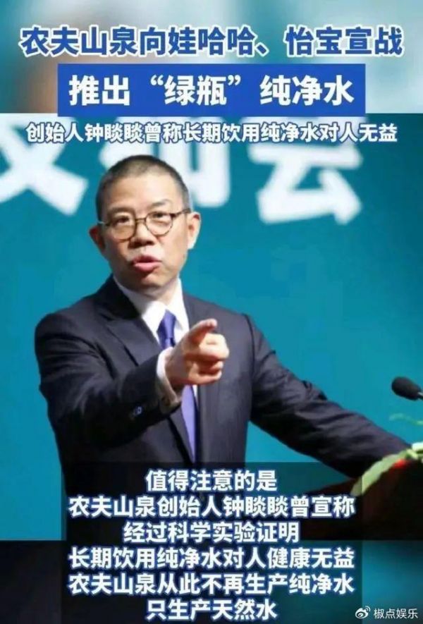 原来,当年农夫山泉面临与饮料巨头娃哈哈的激烈竞争,在上市后不久的2000年,钟晱晱提出一个概念“纯净水对人体无益论”,推出“农夫山泉天然矿物水”。