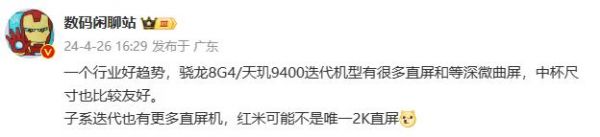 下一代骁龙8Gen4和天玑9400旗舰,屏幕形态基本都是直屏和等深微曲面屏。