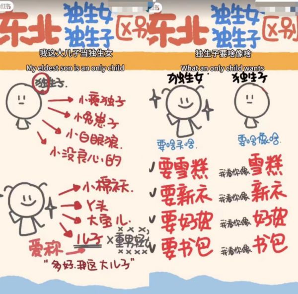 视频里总结道,在东北,儿子是“小兔崽子”,而女儿却是“大宝贝儿”,还戏称父母对待独生女是“要啥买啥”(要雪糕,就给买雪糕),而对待独生子则是“要啥像啥”(要雪糕?我看你像个雪糕)。