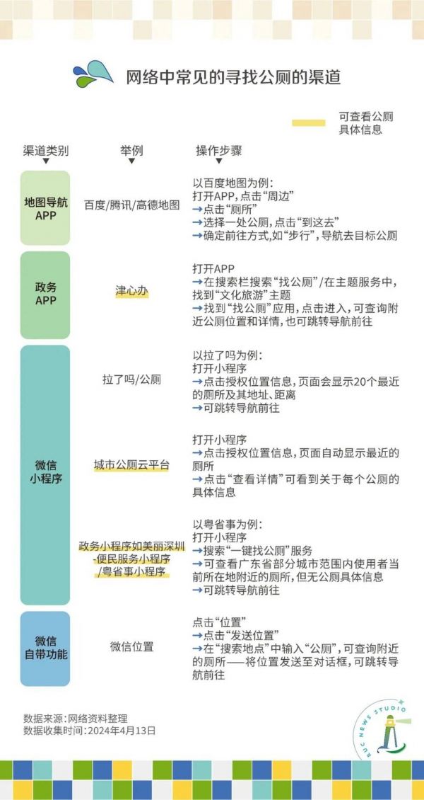 从最常见的地图导航软件到各地的政务服务APP,从微信对话框功能到专为找厕所设计的小程序,各个平台都留下了人们找厕所的身影。小红书上有笔记分享北京、上海等地的地铁厕所分布,详细罗列了每条地铁线上哪一站的何处站台有厕所,数千名网友在底下称赞楼主“功德无量”。