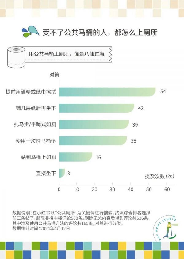 抵触公共马桶的人在社交媒体分享自己上厕所的“独门诀窍”:纸巾是最重要的工具,不仅可以用于擦拭清洁,必要时还能充当坐垫;稳扎马步、悬空半蹲是必须掌握的功夫,甚至有人选择站到马桶上如厕。