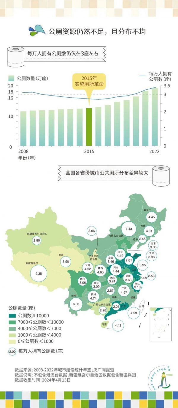 住房和城乡建设部最新公开的《2022年城市建设统计年鉴》数据显示,尽管全国公共厕所数量连年增加,但每万人拥有的公厕数长期不足3座,自2015年实施厕所革命后才有了明显的上升趋势。2022年,全国公厕总数超过19万座,每万人拥有的公厕数也提升至3.43座,但相比庞大的人口基数仍然不够。
