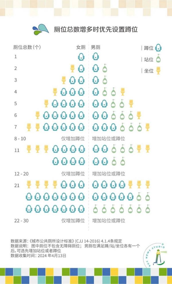 首先,在公众最关心的马桶和蹲坑之争上,蹲位由于占地面积更小、使用起来效率更高,应该被优先设置且数量占优。男厕厕位设置中,也是更为便捷的蹲位和站位数量更多,而坐位最少。在资源有限的情况下,坐位的设置更多是为了满足特殊人群的需求。
