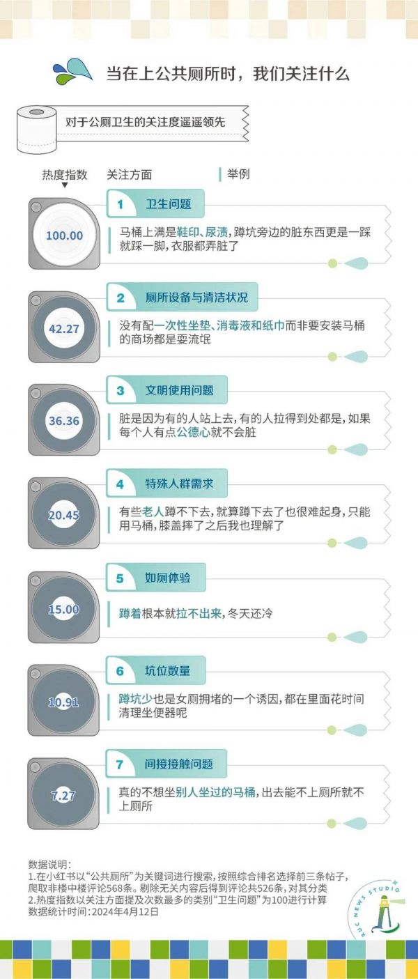 马桶和蹲坑的讨论指向的是人们最关注的公厕卫生问题,除此之外,厕所配备不全、如厕体验差、坑位数量少等同样在社交媒体上备受吐槽。