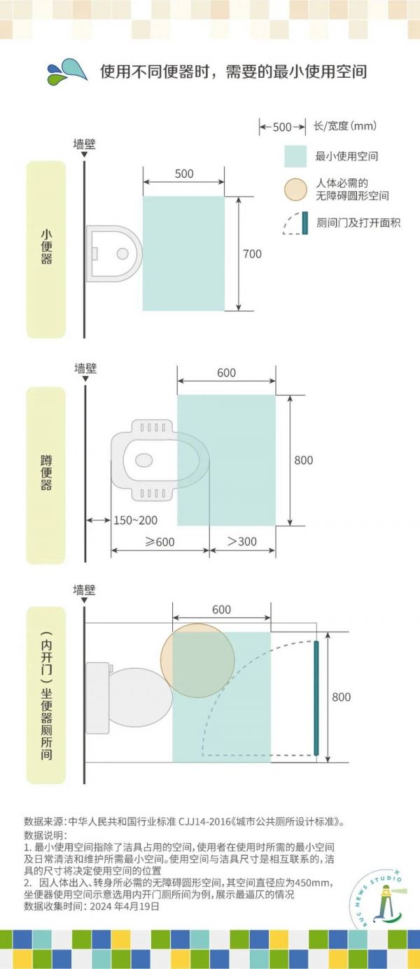 最后,厕位内部的空间分配也有许多讲究,蹲便、坐便和站便分别对应着不同的最小使用面积。理想情况下,公厕不会是逼仄的“立锥之地”,我们不用时刻提防着自己的身体与厕所墙壁来个亲密接触,更不会在上完厕所起身时撞到面向的厕门。