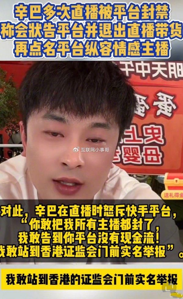 辛巴在直播中对快手平台进行了严厉的批评,称其为“垃圾平台”,并指责快手纵容情感主播制造虚假人气和虚假数据。此外,辛巴还下令其团队的所有主播无限期停播。