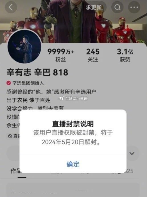 4月20日,辛巴因其直播中的不当言论和行为再次被快手平台封禁。