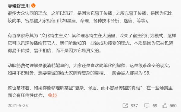 硅谷王川在2021年发过一条微博,他说:“很多大众认同的理论,之所以流行,是因为它易于传播;之所以易于传播,是因为它比较简单,容易被大家相信”。诚哉斯言!